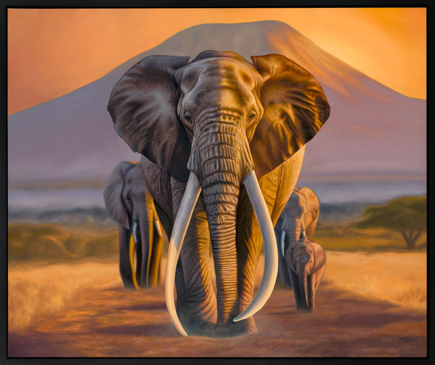This is the ORIGINAL PAINTING of an elephant herd in front of Mount Kilimanjaro by Kirsten Mirrey. A true 1/1 that will never be repainted.