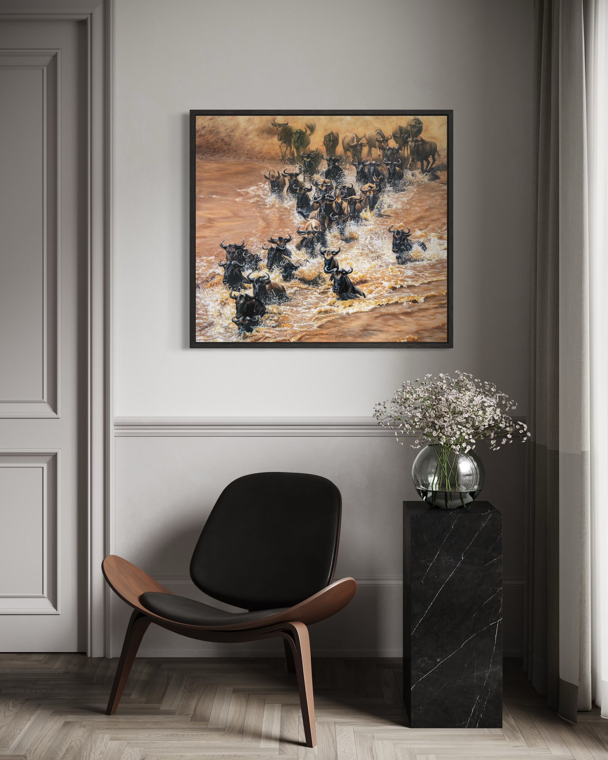The Crossing captures a dramatic herd of wildebeest pushing through the murky waters of Kenya’s Mara River, a scene charged with instinct, danger, and collective strength, produced as a museum-quality canvas print for wildlife art collectors.